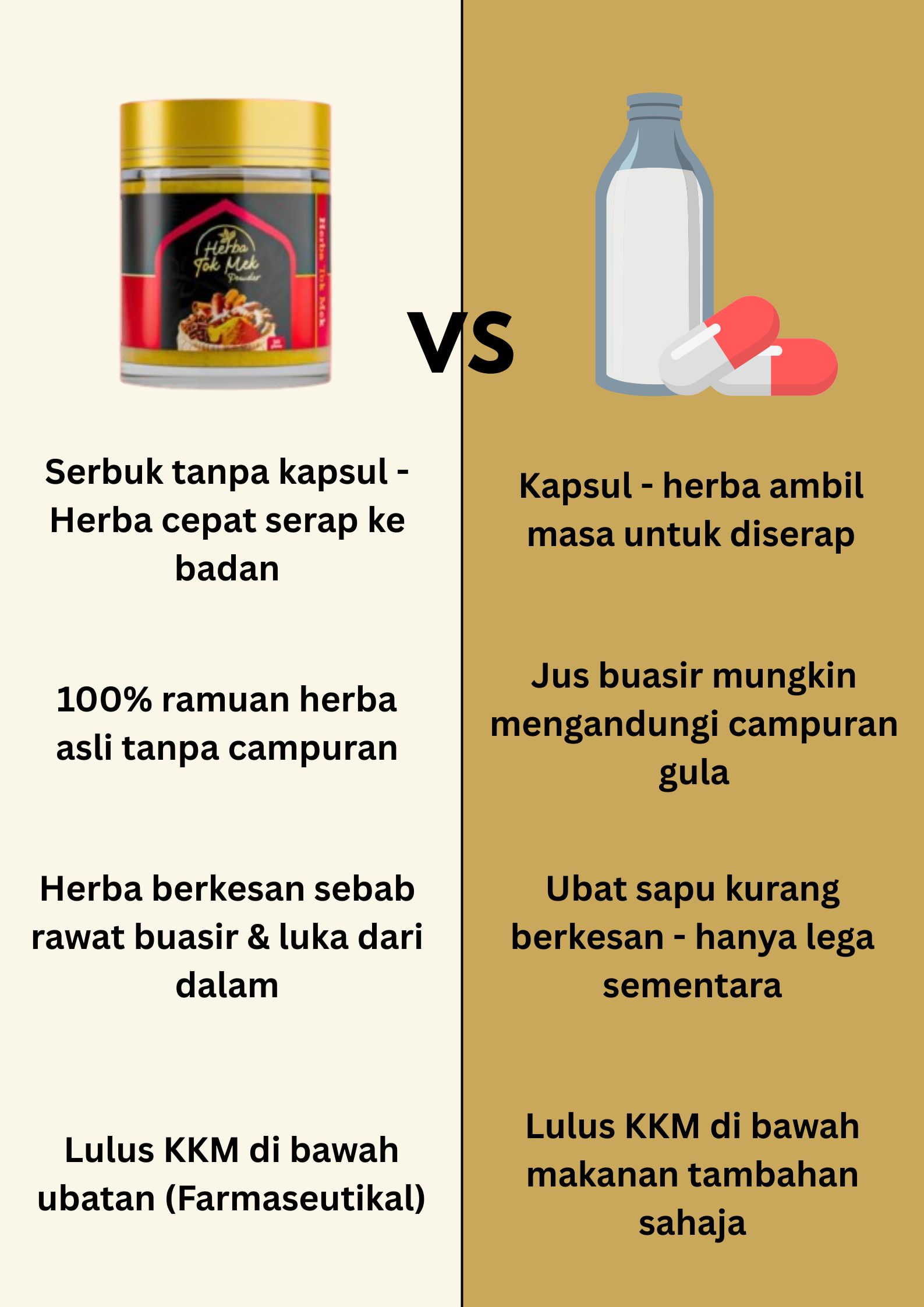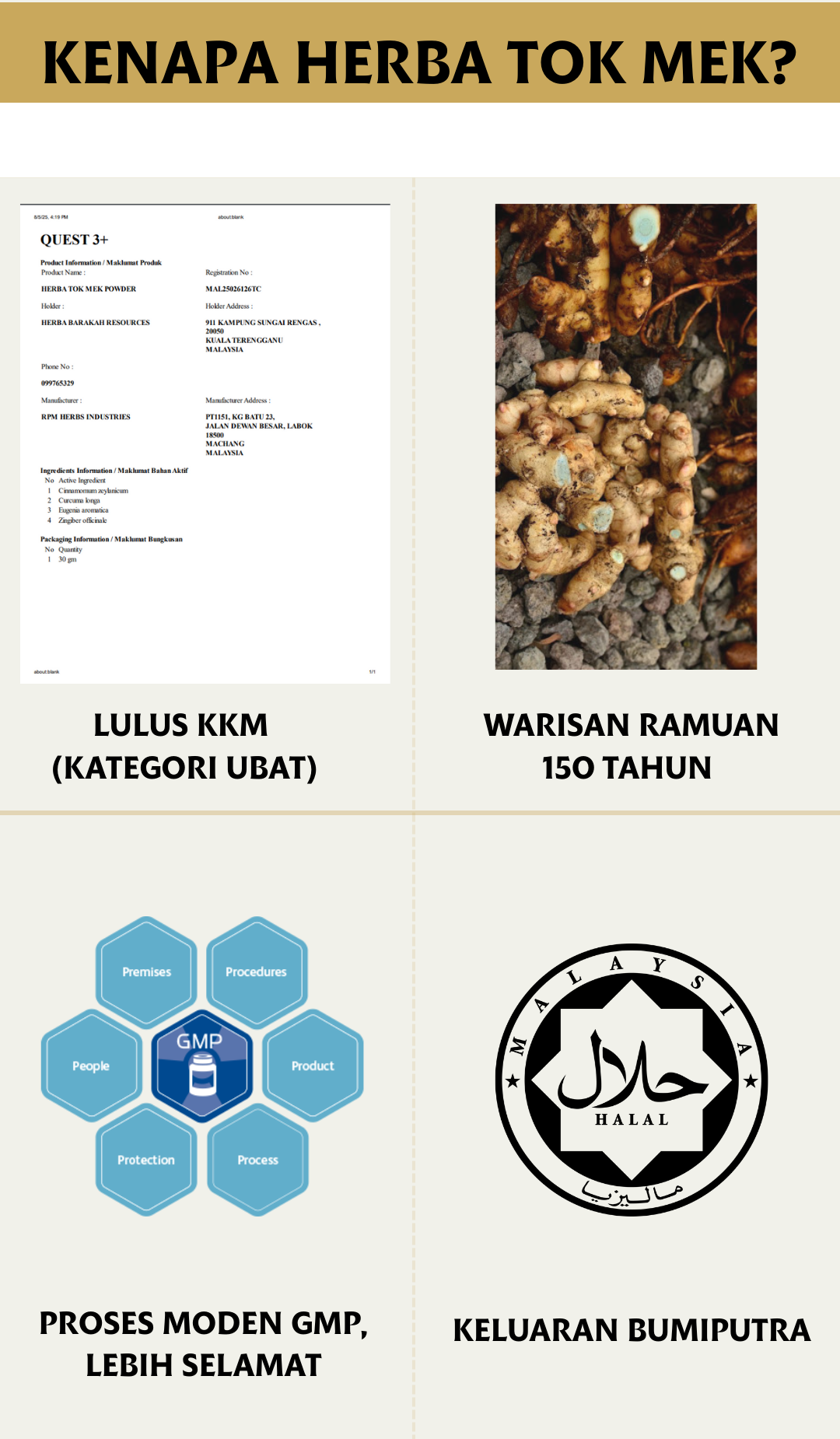 Herba Tok Mek adalah 100% herba asli yang tiada bahan meragukan. Dan juga lulus KKM di bawah kategori ubat herba (MAL25026126TC)