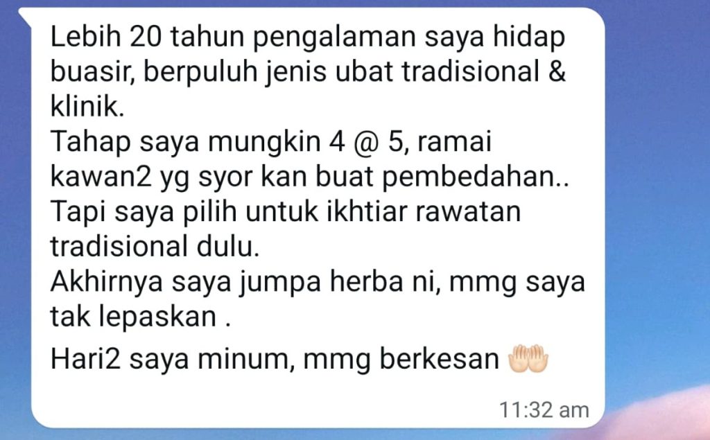 Namun, untuk buasir yang dah lama atau teruk, kami sarankan ambil secara konsisten sehingga cukup tempoh rawatan untuk kesan yang ketara.