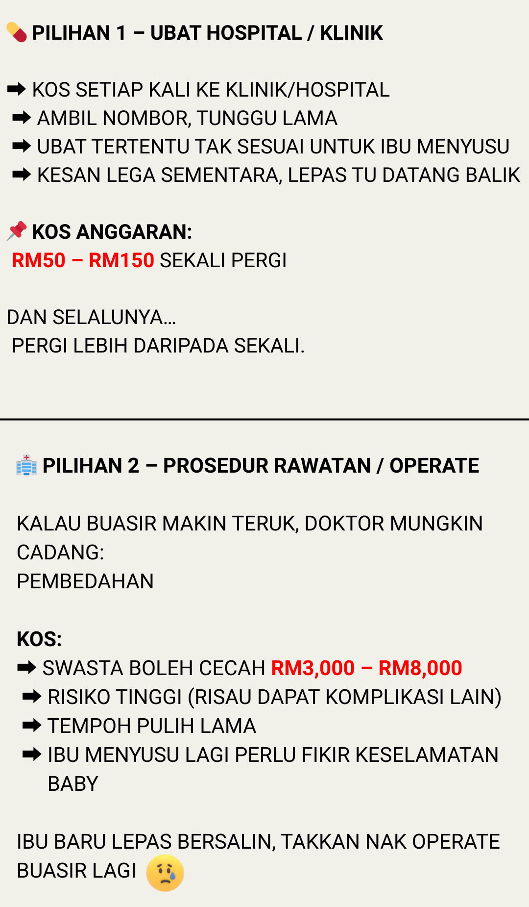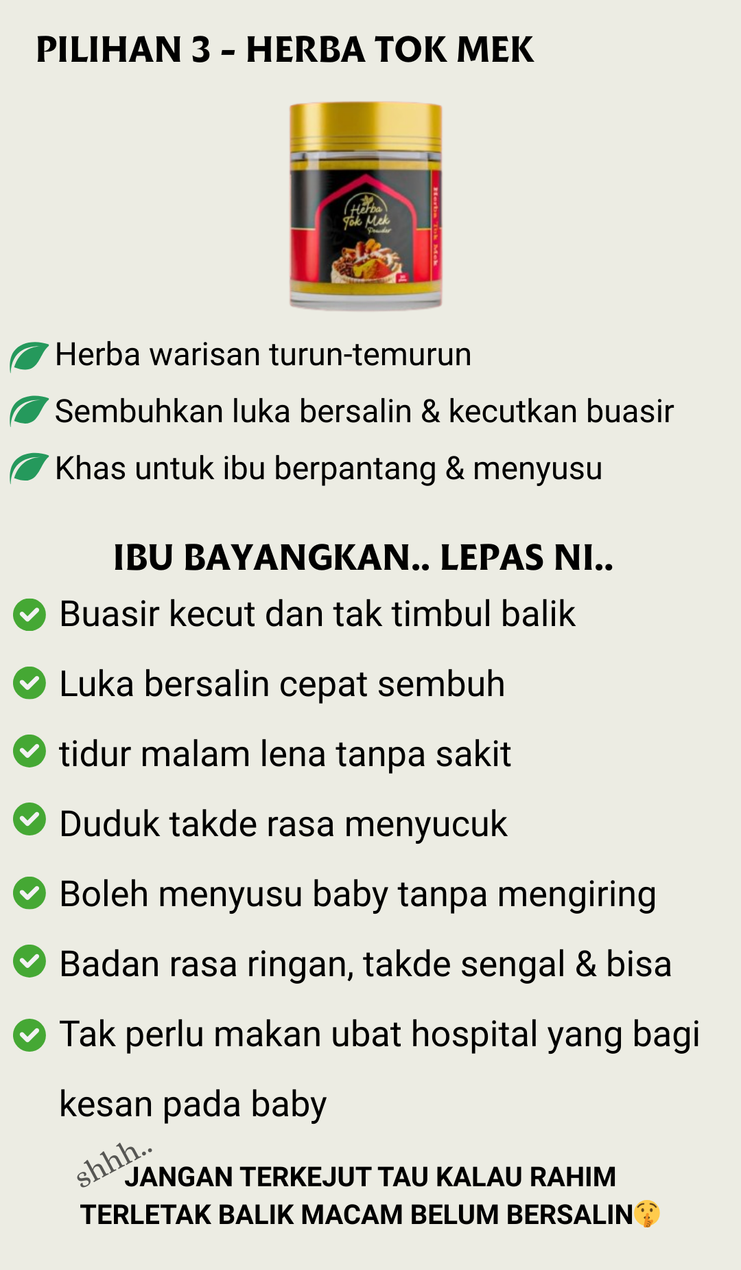 Untuk ibu menyusu, sebaiknya elakkan ambil terlalu banyak ubat serentak. Ramai ibu memilih Herba Tok Mek sebagai ikhtiar utama kerana ia lebih lembut dan berasaskan herba. Jika ragu, ambil jarak masa antara pengambilan.